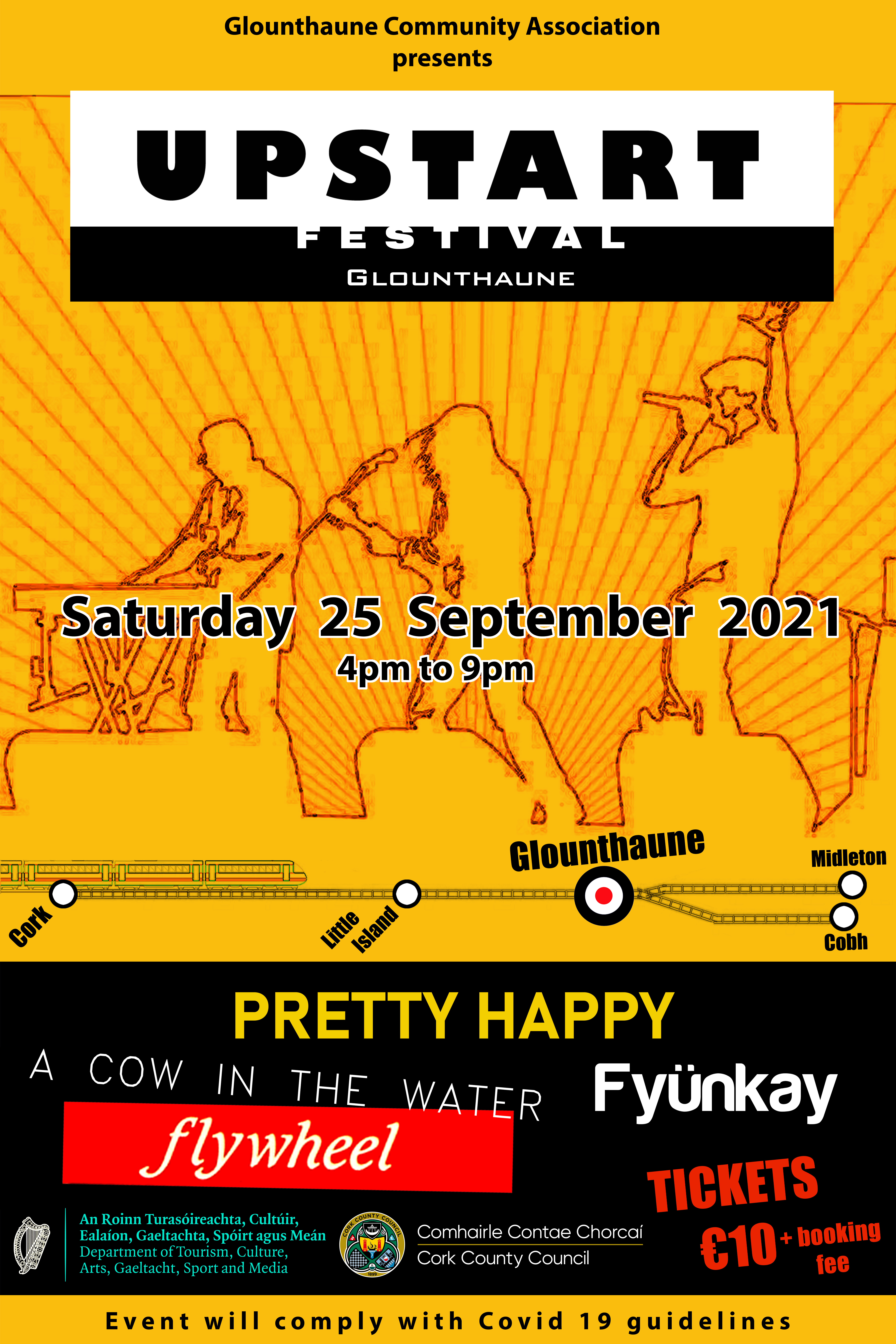 Upstart Festival Glounthaune is supported by the Department of Tourism, Culture, Arts, Gaeltacht, Sport and Media's Local Live Performance Programming Scheme, and is one of the final events in the Cork Co Co Pops summer live performance series provided by Cork County Council to support performers and bring live events to local communities.